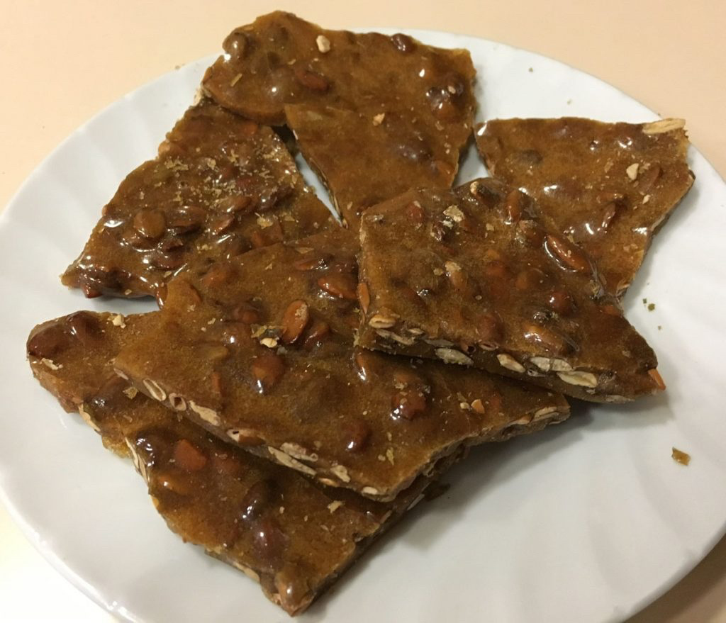 My first attempt at homemade pumpkin seed brittle came out great! After cooking, stirring, and pouring onto the sheet, I covered it with wax paper and hammered it with a rolling pin to get the finished product.